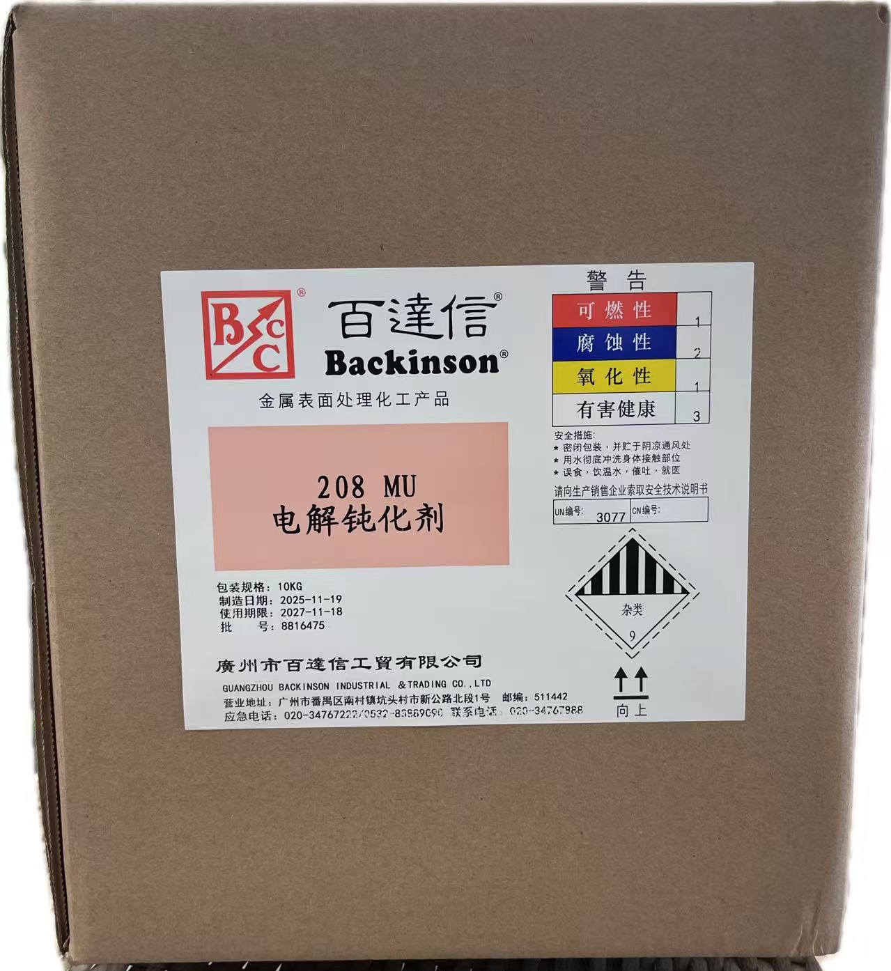 电解钝化剂 208 是一种优秀的钝化保护剂,能适用于大部份金属表面,如金、银、铜、青铜、铜合金及枪色等。透过阴极电解方法能在金属表面产生一层钝化膜,可令金属表面保持光亮,不致氧化而发黑,延长存放时间,并可采用挂镀或滚镀方法,操作极之简易。