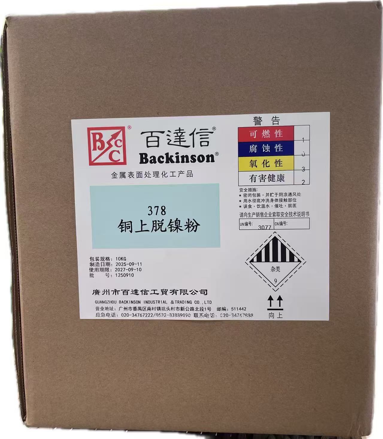 铜上脱镍粉No.378 乃一种干粉状化合物,与硫酸互溶于水。作为铜或铜合金基体金属上镍层之剥离,对铜底不会侵损。可减轻脱镍后的打磨工作。